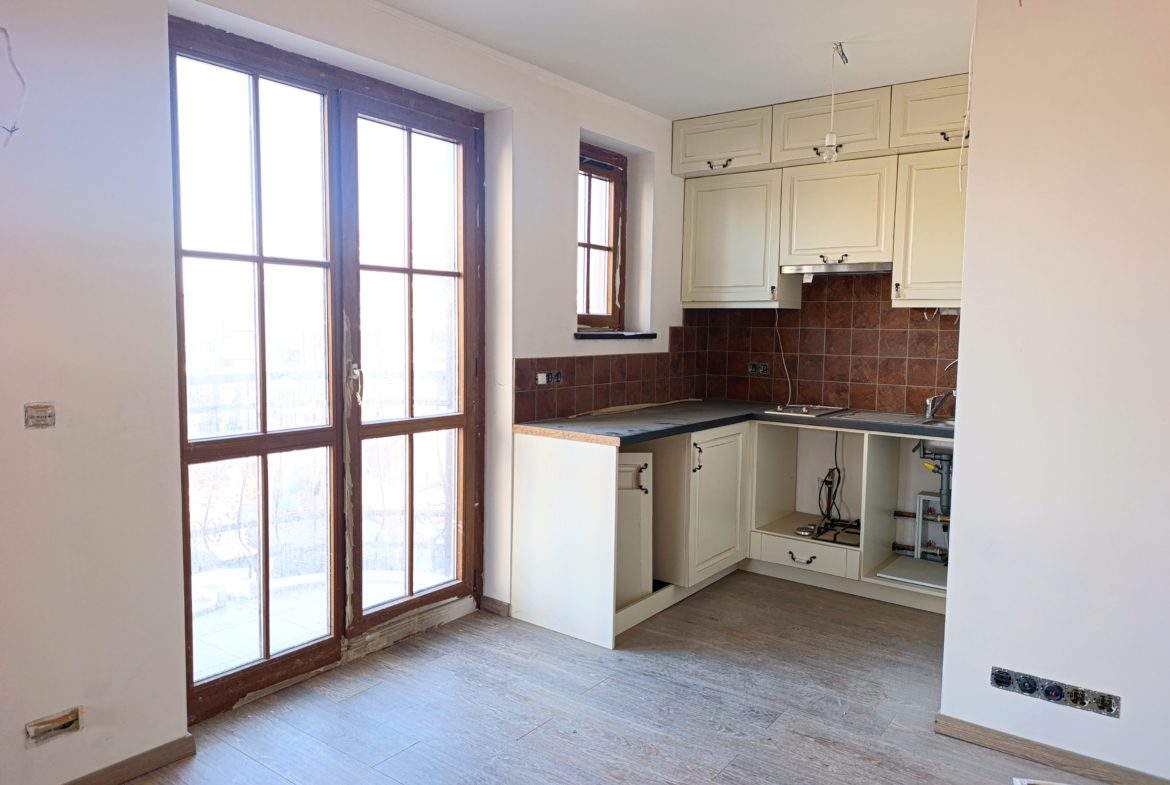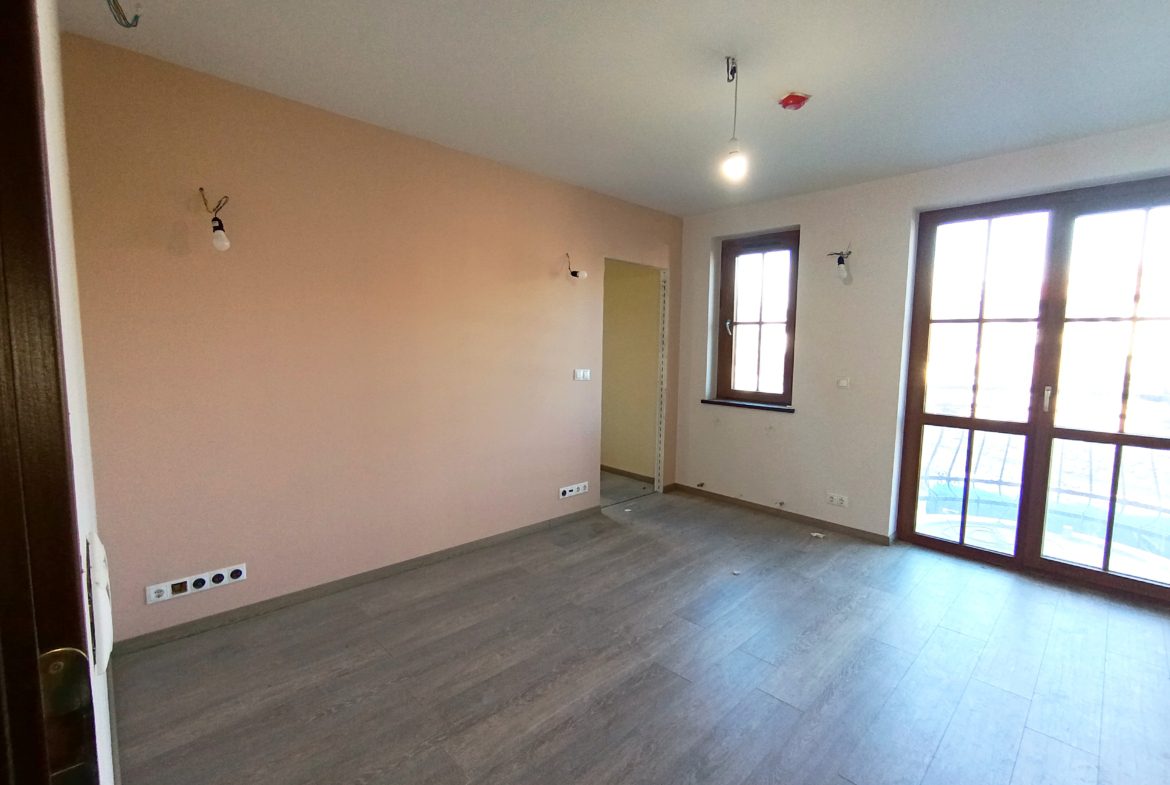 Апартаментът е с площ от 44 кв.м на 3 етаж, състои от баня с с душ и тоалетна, дневна, малка тераса с гледка към двора, и спалня.