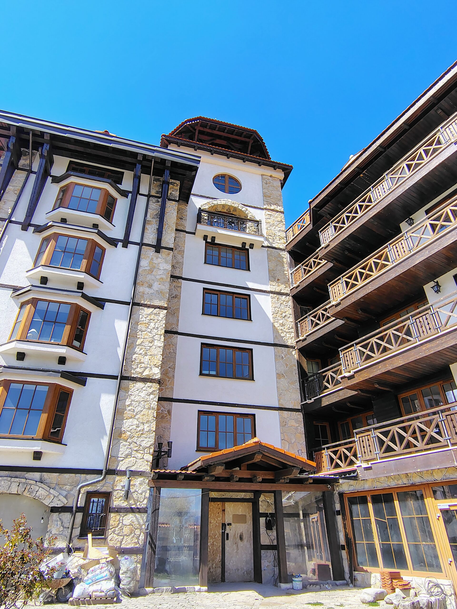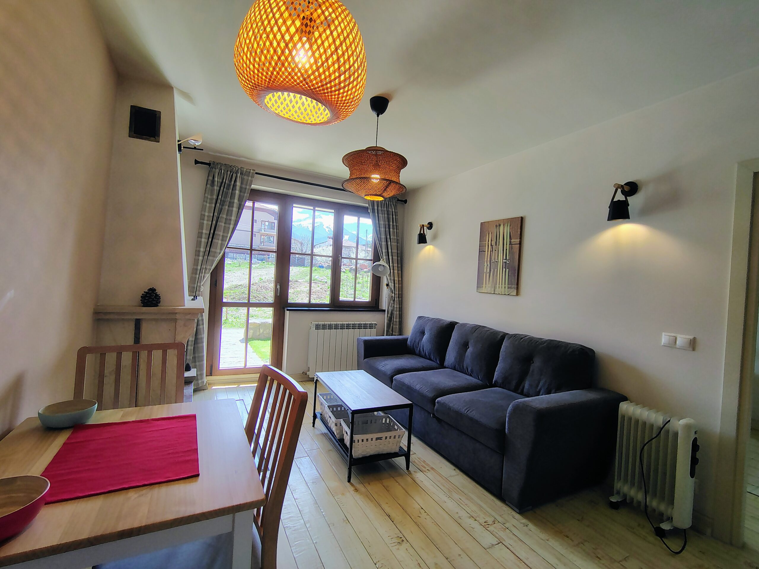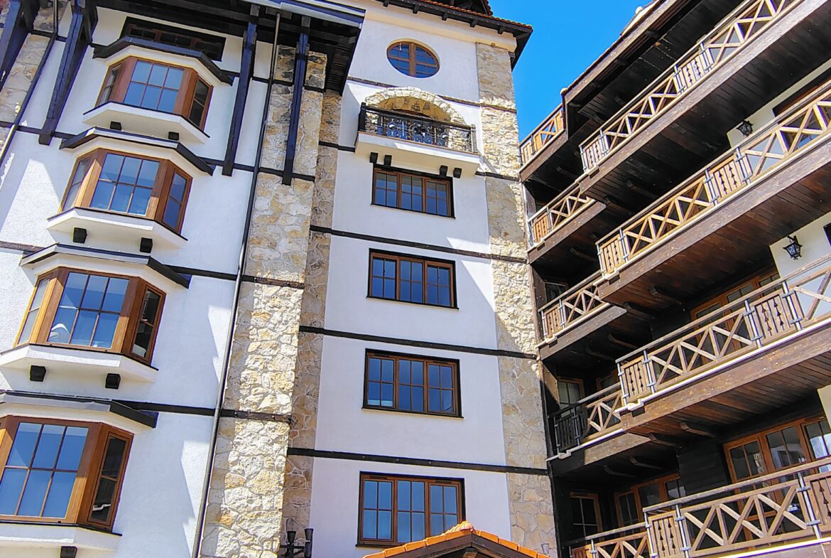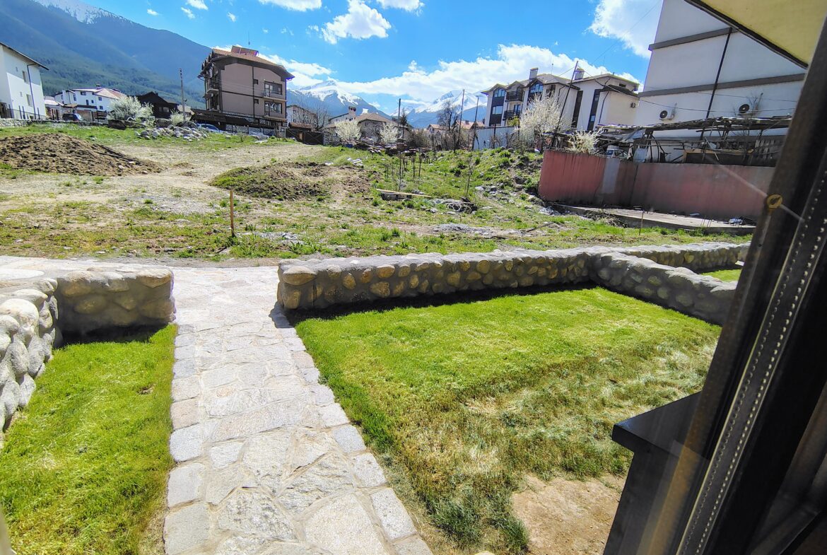 Комплекс KuKuRjak, близо до градския парк. Тристаен апартамент с много естествен свет, с южно изложение, с пълно обзавеждане, напълно оборудвана кухня, качествени материали, камина. Обща площ 97 кв. м. Състои се от дневна с камина, две спални, две бани, тераса с панорамна гледка към планина. Една спалня и дневна е с южно изложение, втора спалня е северно изложение, партерен етаж с двора.